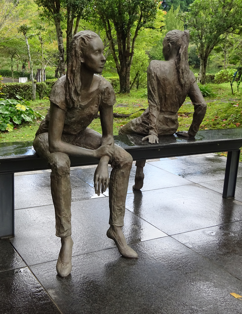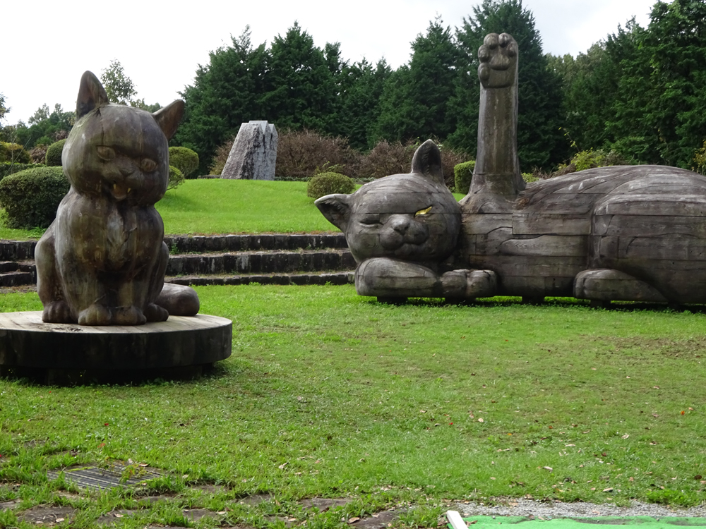 前日の雨も上がり、絶好の行楽日和となりました。現地に10時前に着くと、木製の巨大な猫のオブジェ数体が迎えてくれました。この作品群は、東京芸術大学の学生たちが、作成したものということでした。「巨大寝ころび招き猫」は、杉材では日本最大級の作品とのこと。また同じ場所には朝倉文夫の二女朝倉響子氏制作の「ふたり」という題名の像がありました。彼女は戦後現代具象彫刻の代表的女流作家であり、現代的、都会的な女性をモチーフとした作品で知られているとのことです。この作品は1983年、58歳の時の作品です。
