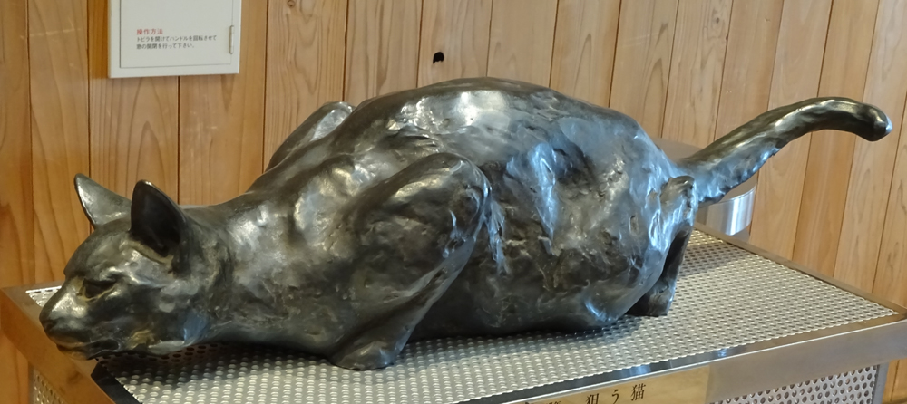 いよいよ朝倉文夫記念館内に足を踏み入れると、猫を一時は10匹以上飼っていたほどの猫好きだった朝倉文夫が、猫のいろいろな姿勢を忠実に再現した銅像が多くみられました。猫が人の言う事を聞かないところも含めて、猫の気ままなところも好きだったそうです。来館中の小学生も喜んでいました。裸婦像もあり、また若き青年の健康的な裸の像もありました。